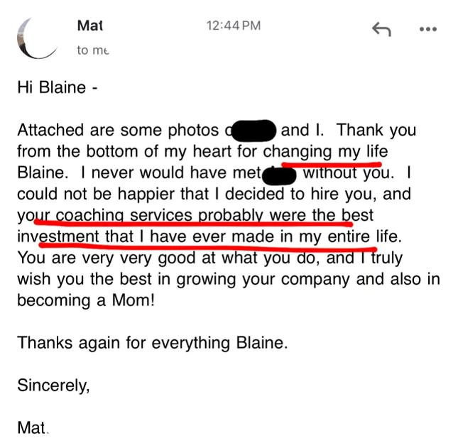 More than 95% report they'd recommend working with me to a friend, and I'm blessed to regularly receive messages like this from my clients: